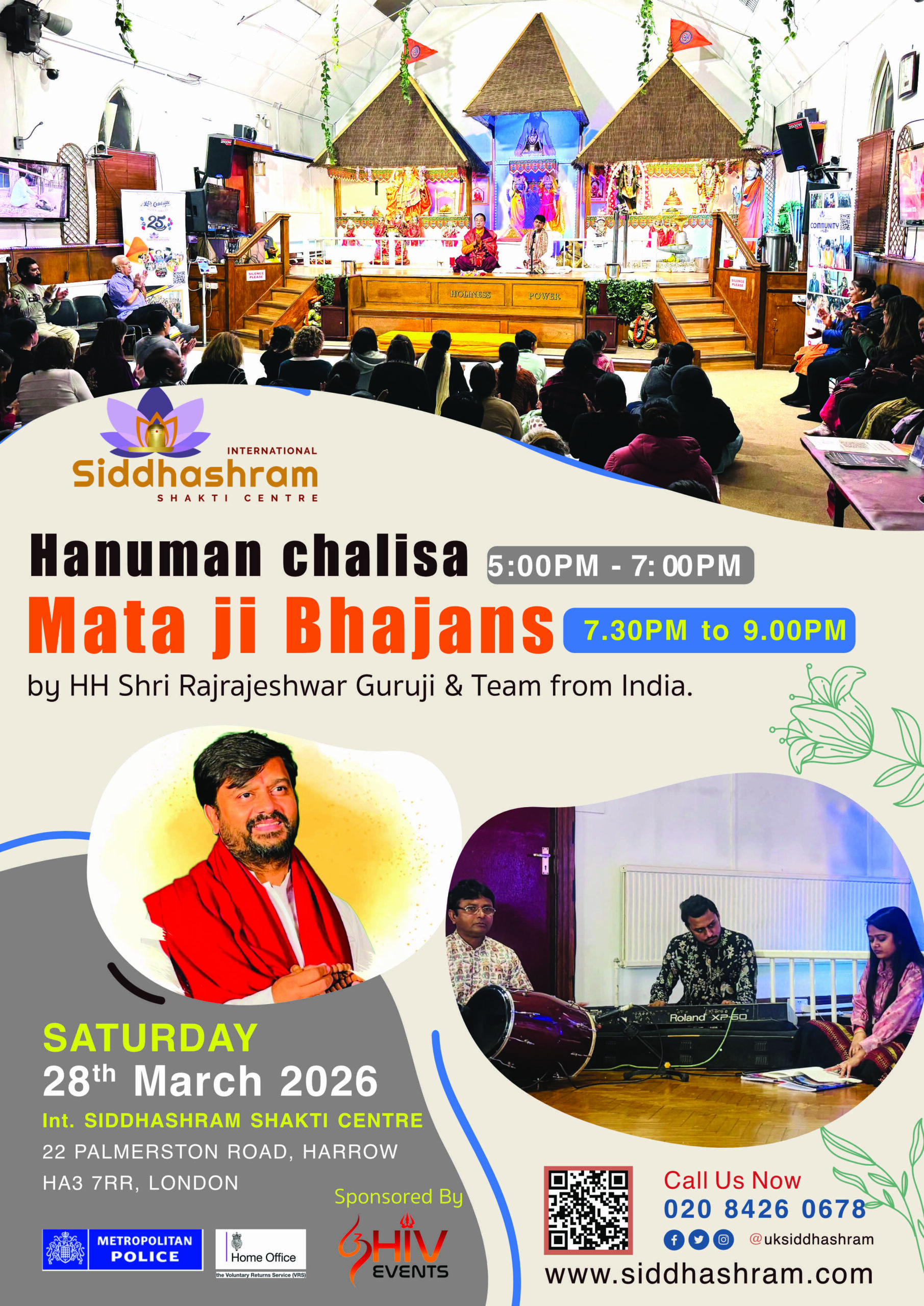 Discovering devotional music that blends Mata Ji Bhajans (hymns dedicated to the Divine Mother) with the Hanuman Chalisa is a popular way to honor the connection between Shakti and her devotee Hanuman, particularly during festivals such as Navratri, in the presence of HH Shri Rajrajeshwar Guruji. The performance features singer Disha Patel and her team from India, Sponsored by Shiv Events.