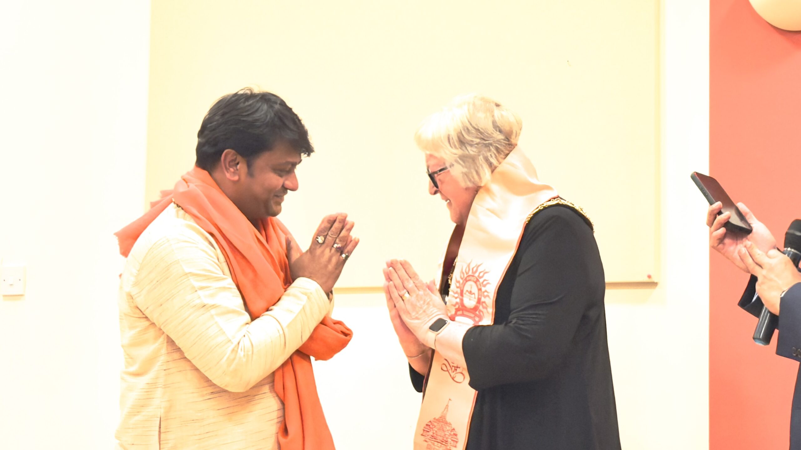 Representing the Sanatan Hindu community with great pride and reverence, HH Shri Rajrajeshwar Guruji delivered a heartfelt and inspiring message emphasizing the importance of compassion, tolerance, and mutual respect across different faiths. As a gesture of respect and solidarity, Guruji honored several distinguished individuals who have made significant contributions to fostering interfaith dialogue and community cohesion. Among these were Cllr Lynn Chesterman, the esteemed Mayor of Welwyn Hatfield Borough Council, who has been a prominent advocate for community engagement and inclusivity; Valerie Skottowe, Co-chair of Welwyn Hatfield Interfaith, recognised for her dedicated efforts in promoting interfaith understanding; and Frank Marsh, Co-chair of the Welwyn Hatfield interfaith group, known for his active participation and leadership in various community initiatives.